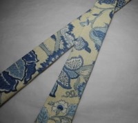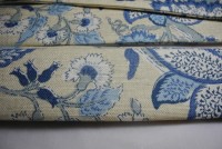 この布地はアンテークショップで手に入れたものですが、まるで我が国の「藍染め」のような青の濃淡で植物のエキゾチシズムが描かれています、
